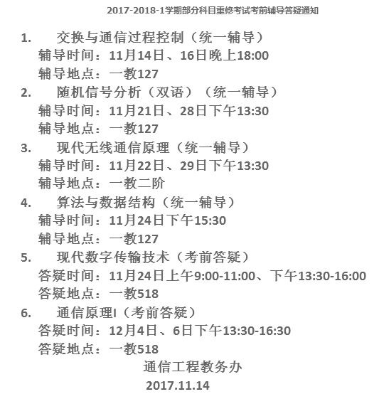 2017-2018-1学期部分科目重修考试考前辅导答疑通知