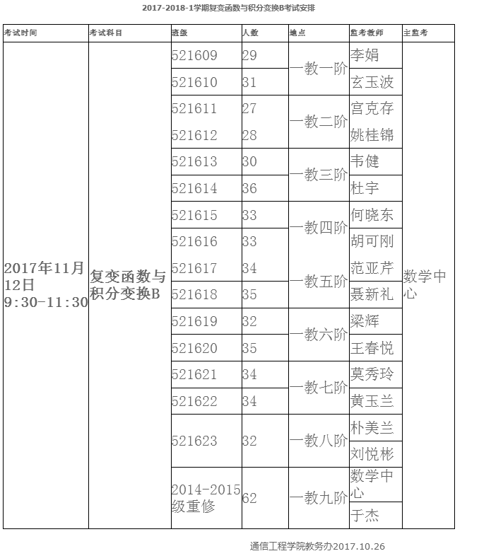 2017-2018-1学期复变函数与积分变换B考试安排