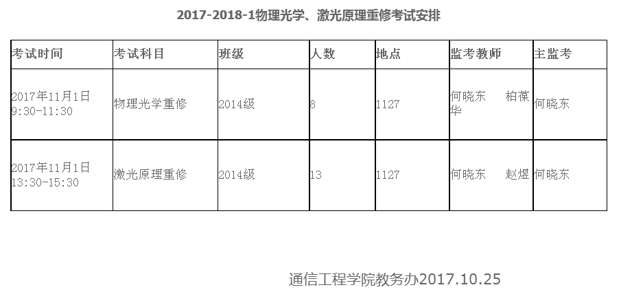 2017-2018-1物理光学、激光原理重修考试安排