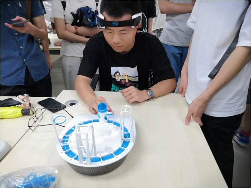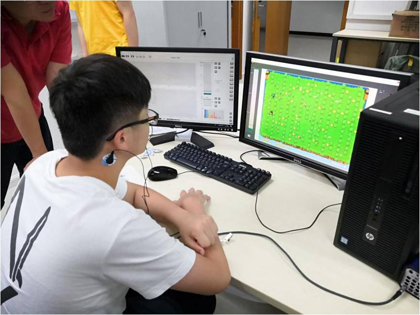 的万峰老师带领同学们去实验室参观了三项具体的实验,第一项是专注度训练项目,即用不同的专注度控制不同频段的风力以驱动小球越过障碍;第二项是令被实验者控制脑电波alpha波的大小在阈值之下以控制昆虫的移动;第三项是通过观察两个不同频率的频闪方格在脑中产生同频率的波,通过仪器获取这些波后用算法实现控制小车前后移动的功能。