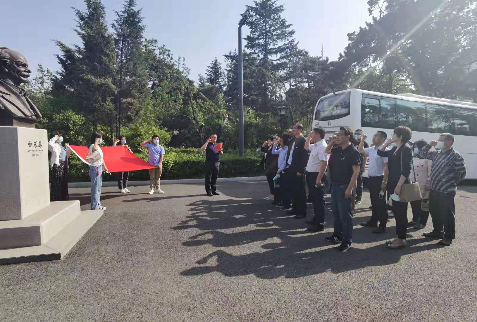 在白求恩纪念馆,馆中一张张旧照片、一件件陈列在橱窗的实物,静静的诉说着白医精神在战火中诞生,在和平中发展的光辉故事。大家追寻着历史的痕迹,感悟着白求恩不惧苦难、视死如归、艰苦卓绝中一次次将伤员从生死边缘救回的大无畏与奉献精神。最后,在白求恩同志雕塑前,全体党员面向党旗,重温入党誓词,庄严宣誓。