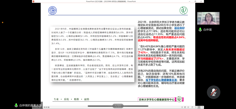 Ms. Bai began the lecture by introducing Chinese peoples mental health conditions. She presented the current mental health condition of adults and enrolled students through detailed and accurate data. Then she proposed two questions, i.e. What will our life be? and What should we do?. Based on the reality among students, Ms. Bai indicated two key factors causing the anxiety of contemporary postgraduate students. While drawing students attention, she used vivid cases and short videos to offer solutions to problems. In addition, she gave a more detailed explanation on how to achieve self-management by managing the goal, the time and the pressure, and how to make good use of resources of knowledge, social connections, and profession. Finally, Ms. Bai elaborated on many methods to deal with and mitigate pressure that emerged from circumstances such as the adaptive crisis, interpersonal relationships, and lack of confidence. It vividly explained how to establish good relationships, enhance students’ empathy in interpersonal communication, and enabled them to adapt to campus life quicker and better.