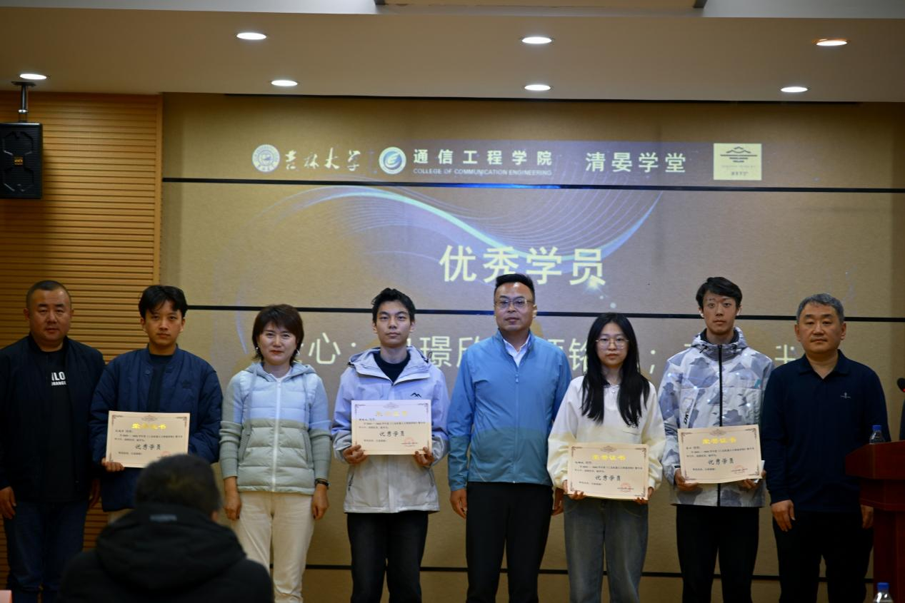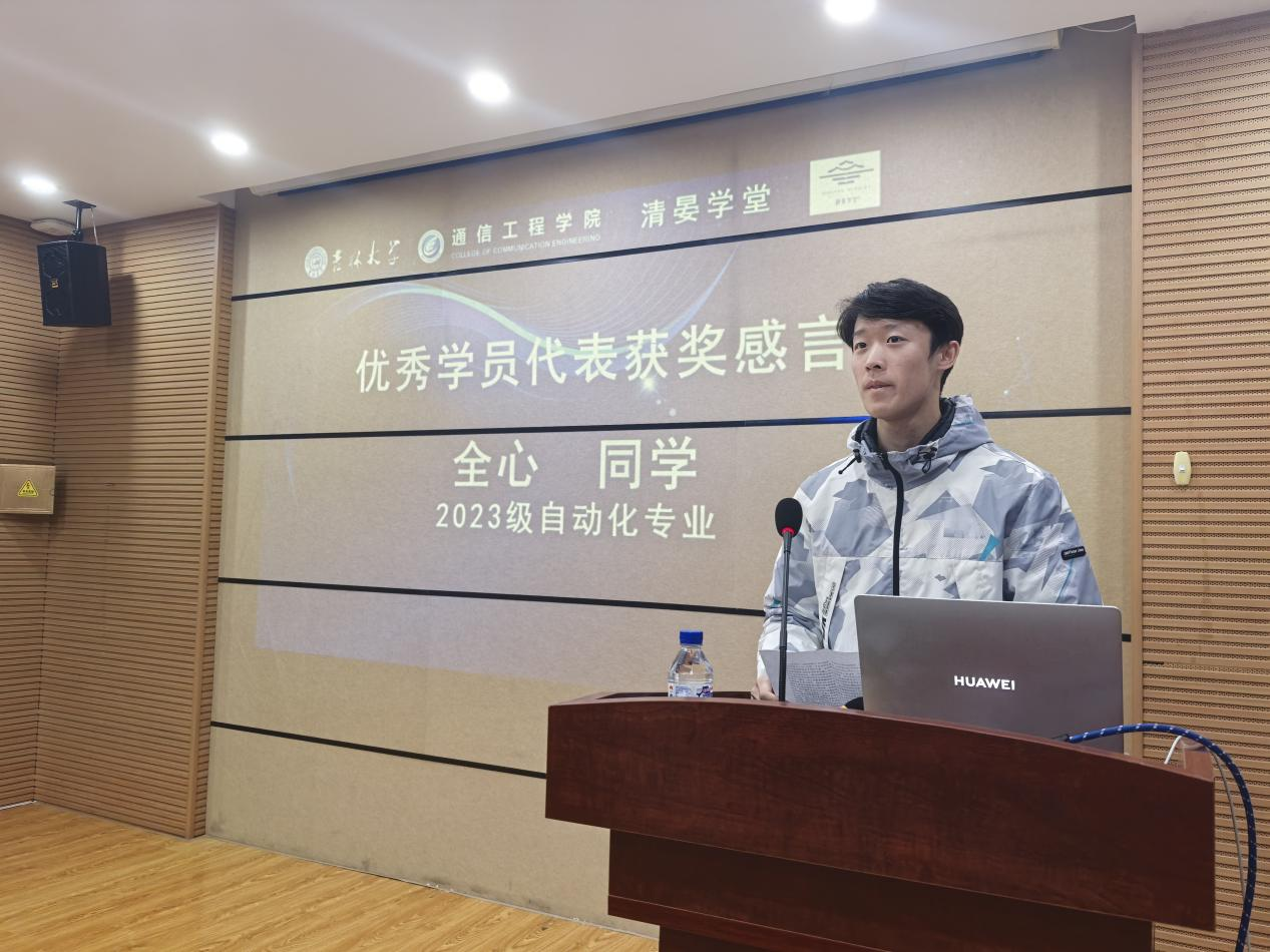随后与会嘉宾为全体结业学员颁发《工业机器人与智能控制》微专业结业证书,并为优秀学员们颁发了优秀学员奖励证书。获奖学员是:包璟欣(硕士研究生)、全心、颜铭池、石鸿升。他们在首届20名学员中脱颖而出,凭借课上所学,参加学科竞赛并获得优异成绩。优秀学员代表全心同学上台发表了获奖感言。他通过微专业的学习,积极参加学科技能竞赛,斩获了4项国家级奖项。他认为微专业的学习显著提升理论分析能力与实践动手能力,为未来职业发展奠定了坚实基础。